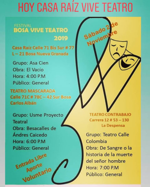 En sus primeros años, la Corporación transitó por diferentes espacios, y luego de seis años estableció su lugar de creación y circulación teatral en Bosa, en la localidad séptima de Bogotá. Durante diez años este lugar al que se denominó Casa Raíz fue un refugio para el teatro bosuno, y un oasis para la creación y los sueños colectivos. Esta casa permitió la presentación de múltiples funciones teatrales, con grupos locales y nacionales, el montaje y circulación de 4 obras de teatro de sala, 3 de calle y una comparsa, el desarrollo de 8 versiones del proyecto comunitario, “Arte Sin Lugar”. También tuvo una biblioteca comunitaria que atendió a la población del territorio en torno a derechos culturales, convirtiéndose en un referente local para la actividad teatral.